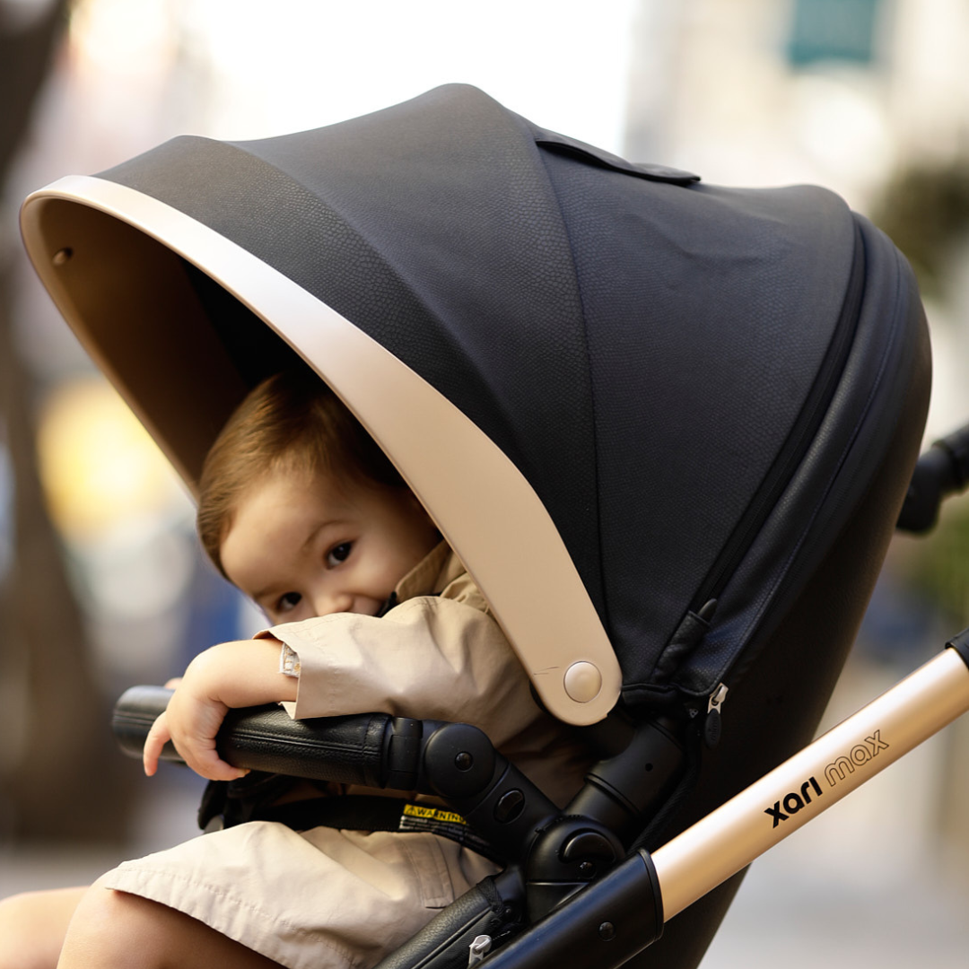 The Xari Max features an extra large seat, full coverage canopy, all wheel suspension, and infant car seat compatibility for seamless use from day one.