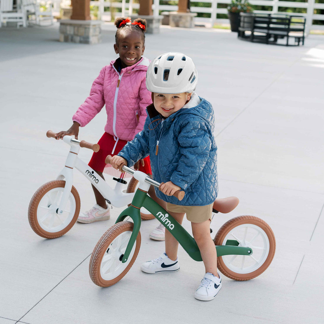 Mima® Zoom White balance bike, standalone side view Boy wearing helmet, riding Mima® Zoom White balance bike on mountain trail