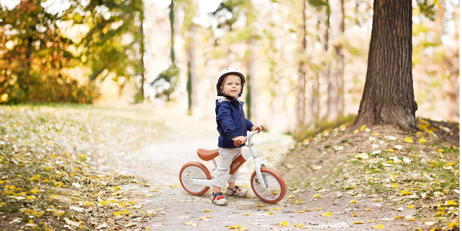 • Boy wearing helmet, happily riding Mima® Zoom White balance bike on grassy field